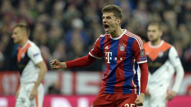 Як і ван Ністелрой, Мюллер також не залишив без уваги українські команди, відзначившись двома забитими м'ячами у воротах «Шахтаря». Дубль у ворота Пятова Томас записав на свій рахунок в Мюнхені в рамках матчу-відповіді 1/8 фіналу ЛЧ-2014/15. Та гра відбулася 11 березня 2015 року та завершилася форменим погромом «гірників», які з третьої хвилини через вилучення Кучера змушені були грати вдесятьох, - 7:0.