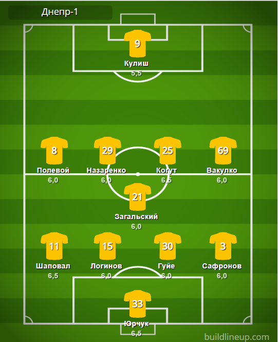Дніпро-1: Юрчук – Шаповал, Гуйє, Логінов, Сафронов – Загальський (Булеца, 67) – Польовий, Назаренко, Когут, Вакулко – Куліш (Супряга, 63).