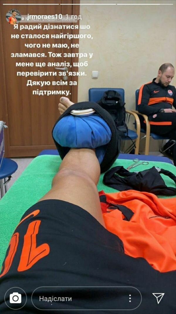 Мораес, якого забрали з поля на ношах, на своїй сторінці в Instagram виклав фото травмованої ноги і повідомив, що перелому у нього немає, написавши: