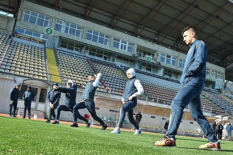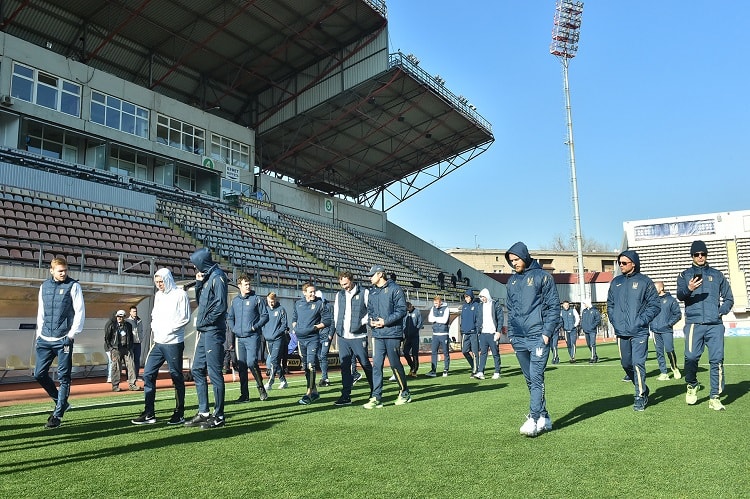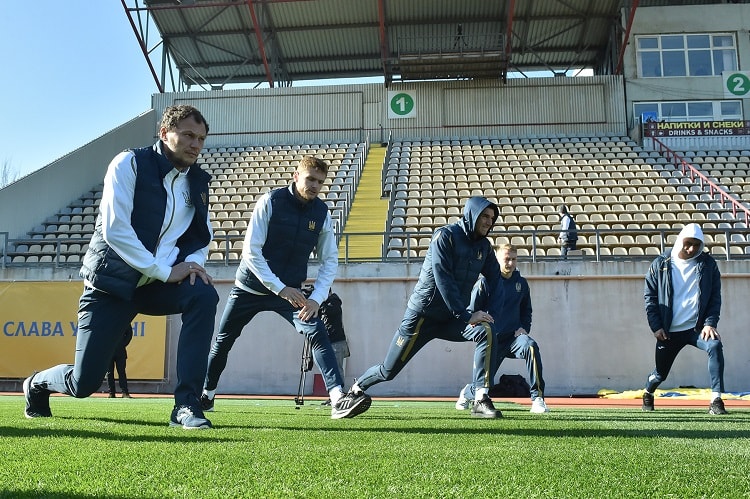Сьогоднішня традиційна передматчева прогулянка збірної України виявилася дещо незвичною. Під час неї команда прибула на «Славутич-Арену». Футболісти походили по газону і залишилися задоволені його станом. Потім під керівництвом тренера з фізпідготовки Івана Баштового вони провели невелику розминку.