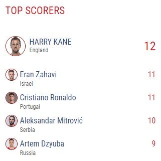 Кейн випереджає форварда португальців Кріштіану Роналду та ізраїльтянина Ерана Захаві, які провели на один гол менше (по 11). 10 забитих м'ячів на рахунку серба Александара Мітровіча.