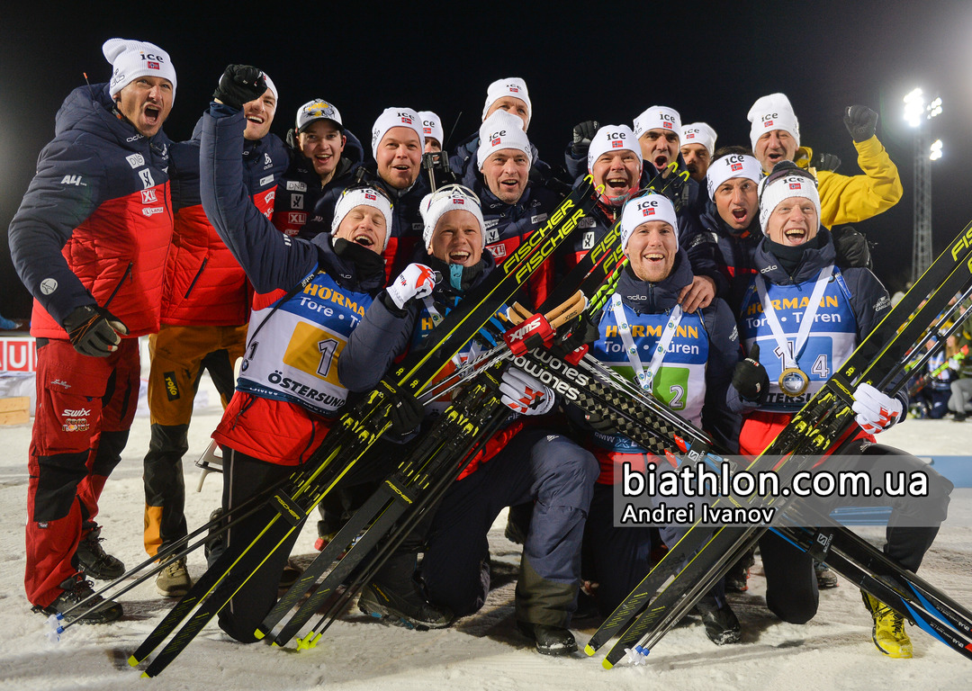 Норвезькі біатлоністи зуміли поквитатися з французами за індивідуальну гонку і здобули перемогу. Мартену Фуркаду і компанії пройшлося задовольнятися срібними нагородами, а третя позиція несподівано дісталася італійцям, які залишили за спиною команди Росії та Швеції.