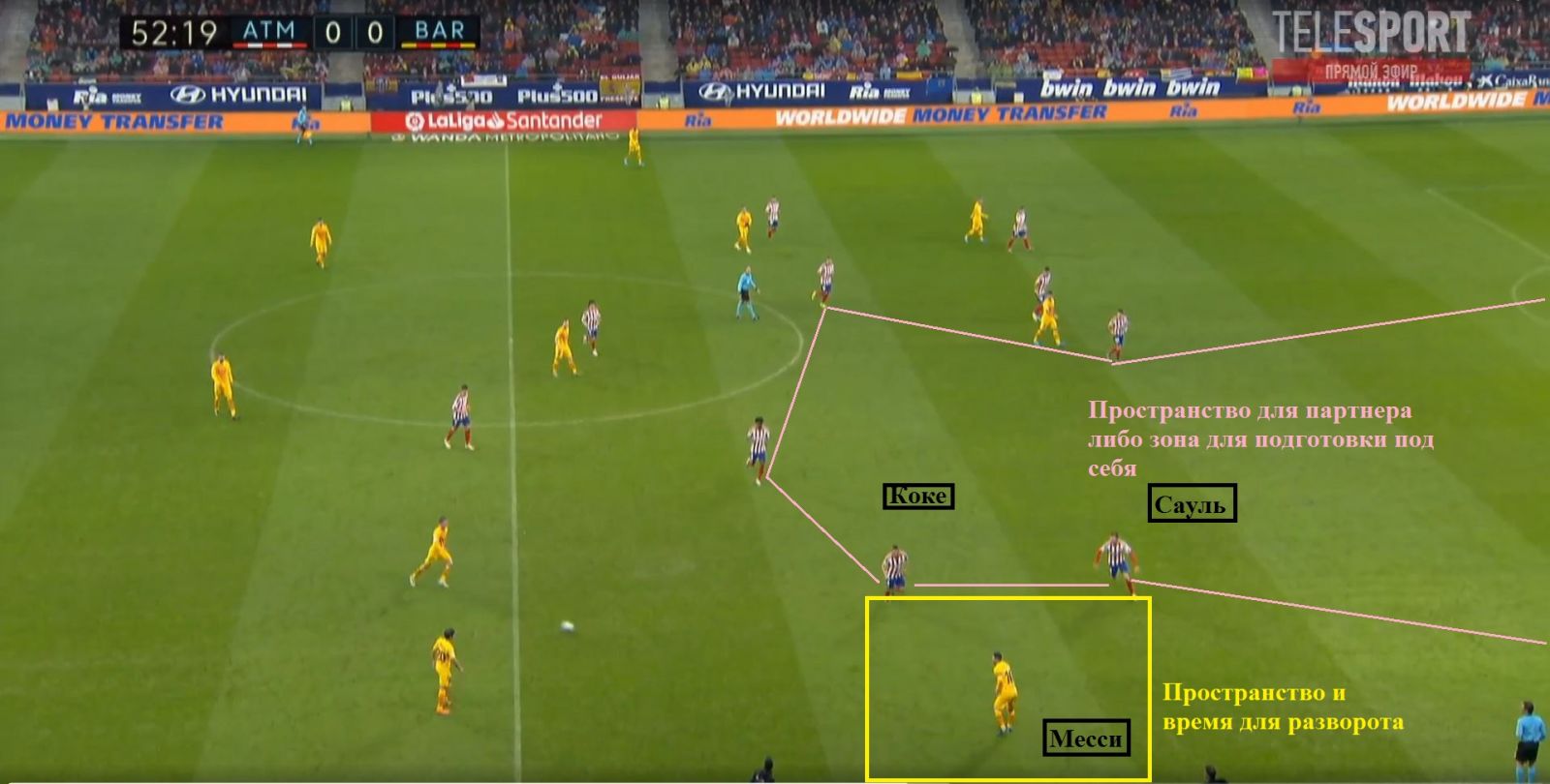 Проти такої команди, як «Атлетіко», найчастіше страждають футболісти, яким потрібен простір. Щільність і велике скупчення футболістів у центральній частині поля змушувало Мессі опускатися нижче або зовсім зміщуватися до бровки. Це дозволяло аргентинцеві