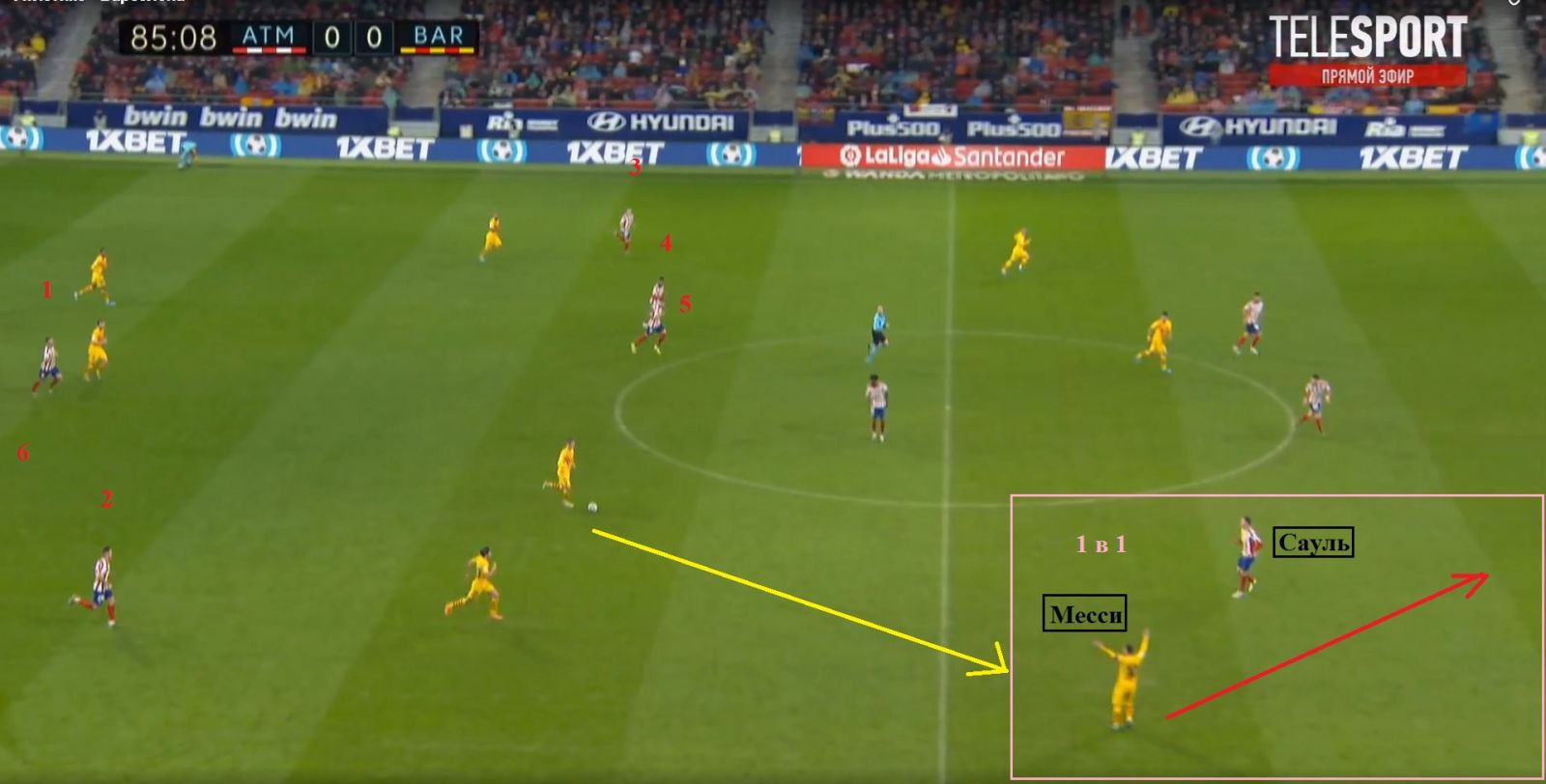 Лемар, який замінив Корреа на 73-й хвилині, здійснює неточну верхову передачу. В результаті 6 футболістів «Атлетико» залишаються відрізаними. Мессі отримує м'яч і, як ми вже відмічали, заздалегідь створивши для себе простір, втікає в зону 1 на 1 проти Сауля.