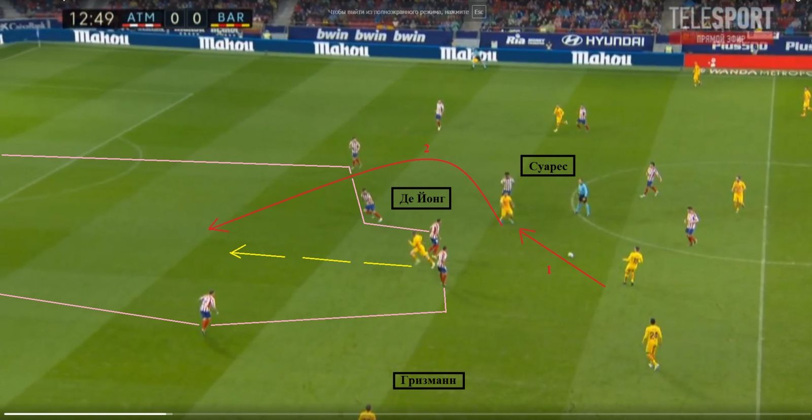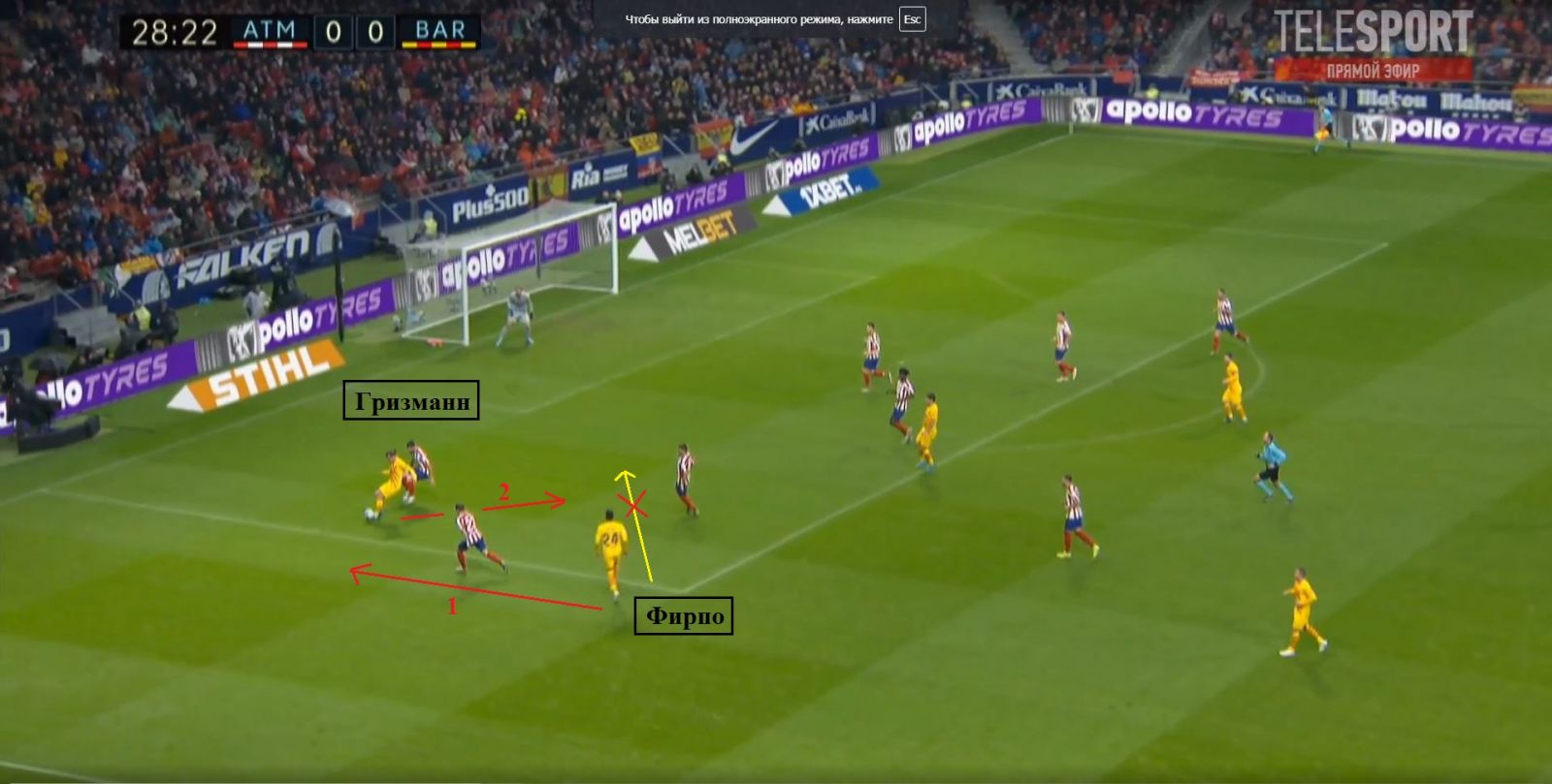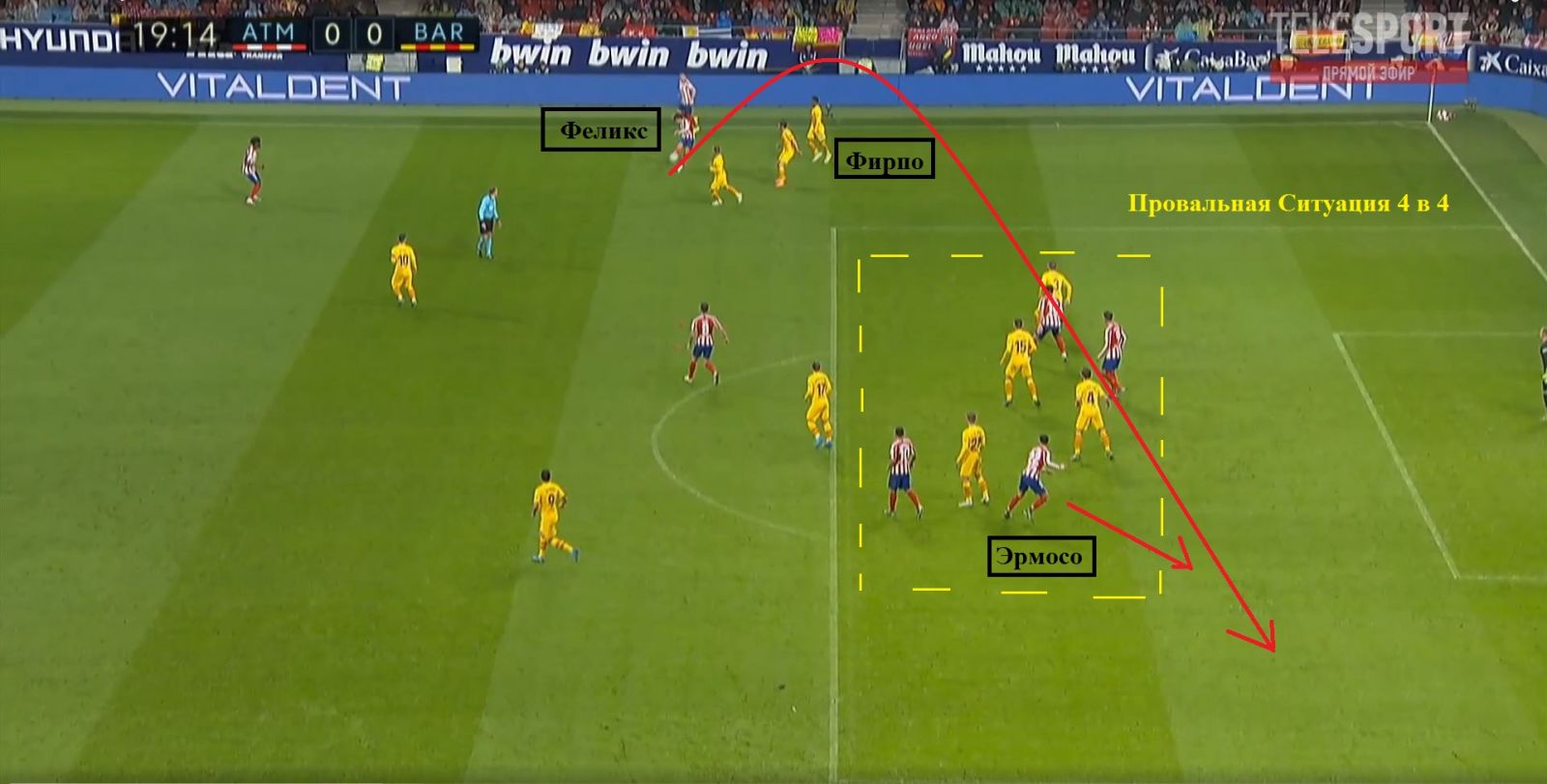 Як на цьому стоп-кадрі. Небезпечніший фланг, на якому діє Мессі, перекритий, а передача слідує на Фірпо, звідки «Барселона» створювала найменшу кількість небезпечних атак.