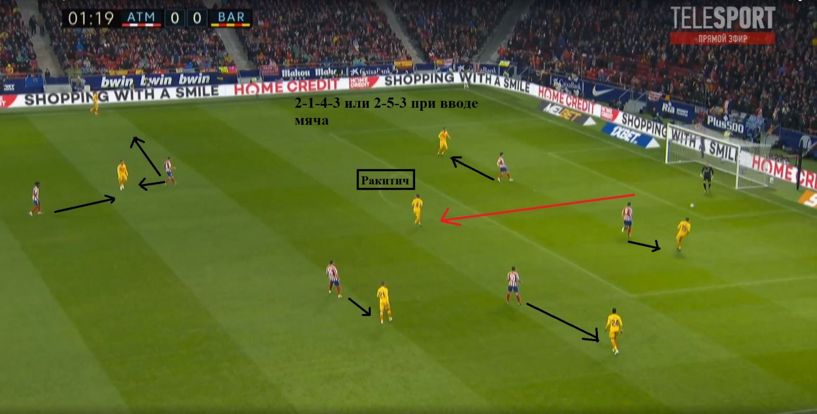 З перших хвилин «матрацники» організували високий пресинг, але зіткнулися з очевидними проблемами. Двох нападників бракувало для того, щоб перекрити усі можливі короткі передачі від Тер Штегена. До того ж, при розіграші від воріт каталонці розташовувалися 2-5-3, що вже створювало чисельну перевагу в середній лінії, плюс до усього, Ракітіч знаходив простір між лінією півзахисту і атаки суперника, що і дозволяло у більшості випадків виходити з-під тиску господарів поля.