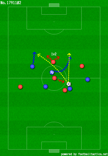 Один з прикладів, де замість того, щоб піти вище і правіше, що створило б великі проблеми суперникові, Роман йде лівіше. Мало того, що він закриває коридор пасу на свого партнера, що піднімається ліворуч, так він ще і полегшує завдання команді, що обороняється, перевантажуючи одну точку (центрбеку суперника не треба тепер розриватися між двома гравцями, що забігають за його спину).