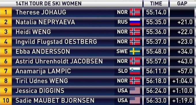 Норвезька лижниця Тереза Йохауг у впертій боротьбі з партнеркою по команді Інгвільд Остберг виграла конькову розділку в Тоблаху (Італія) на третьому етапі Тур де Скі. Цей успіх дозволив Йохауг повернути собі лідерство в загальному заліку.
