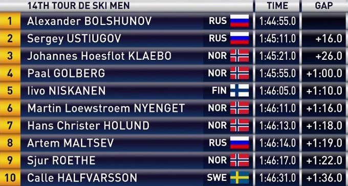 Гонка переслідування класикою на 15 км в Тоблаху на четвертому етапі Тур де Скі привела до зміни лідера загального заліку: Олександр Большунов перехопив жовту майку лідера у Сергія Устюгова. Найкращий чистий час переслідування показав норвежець Мартін Льовстрьом Ньєнгет.