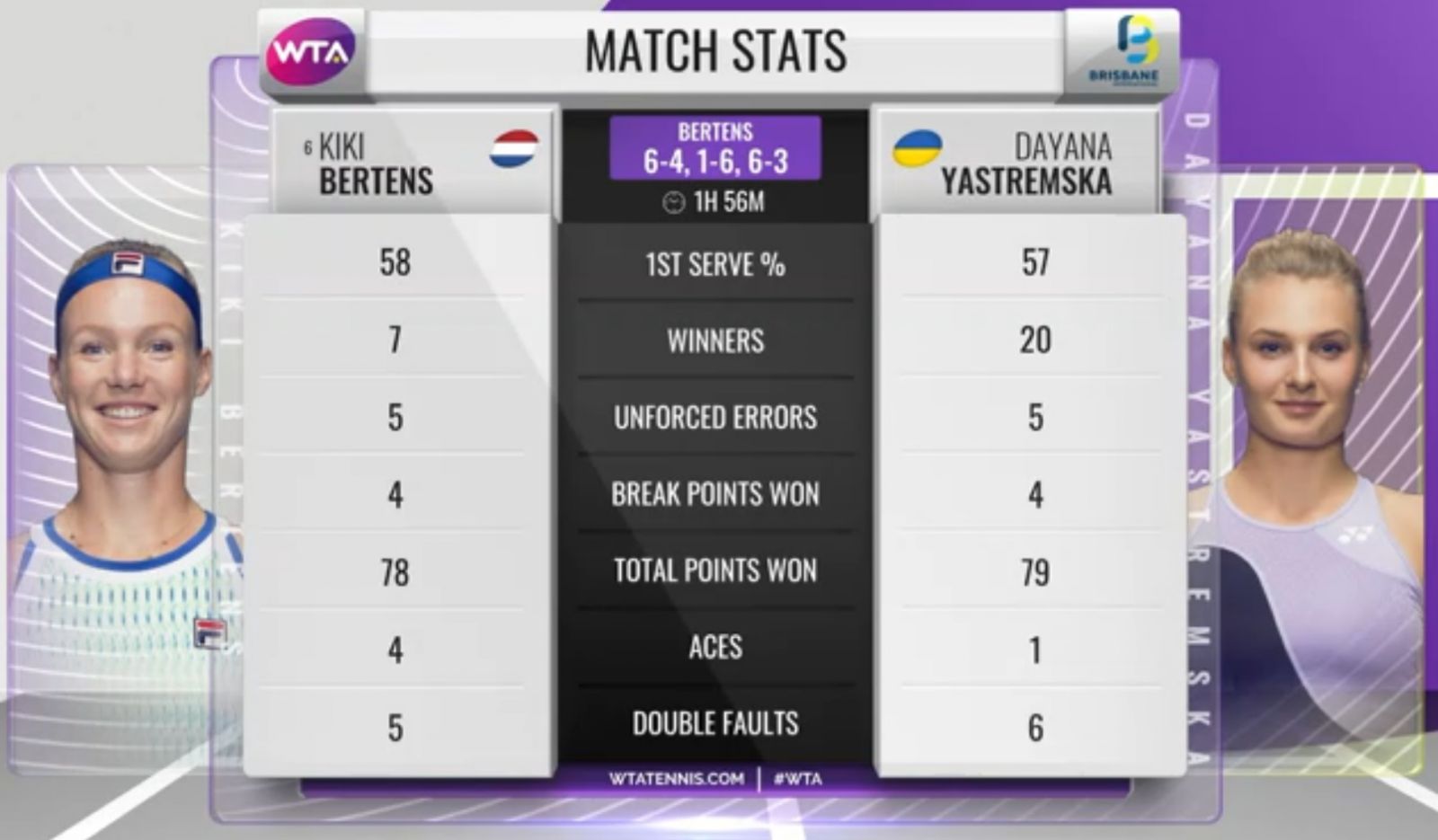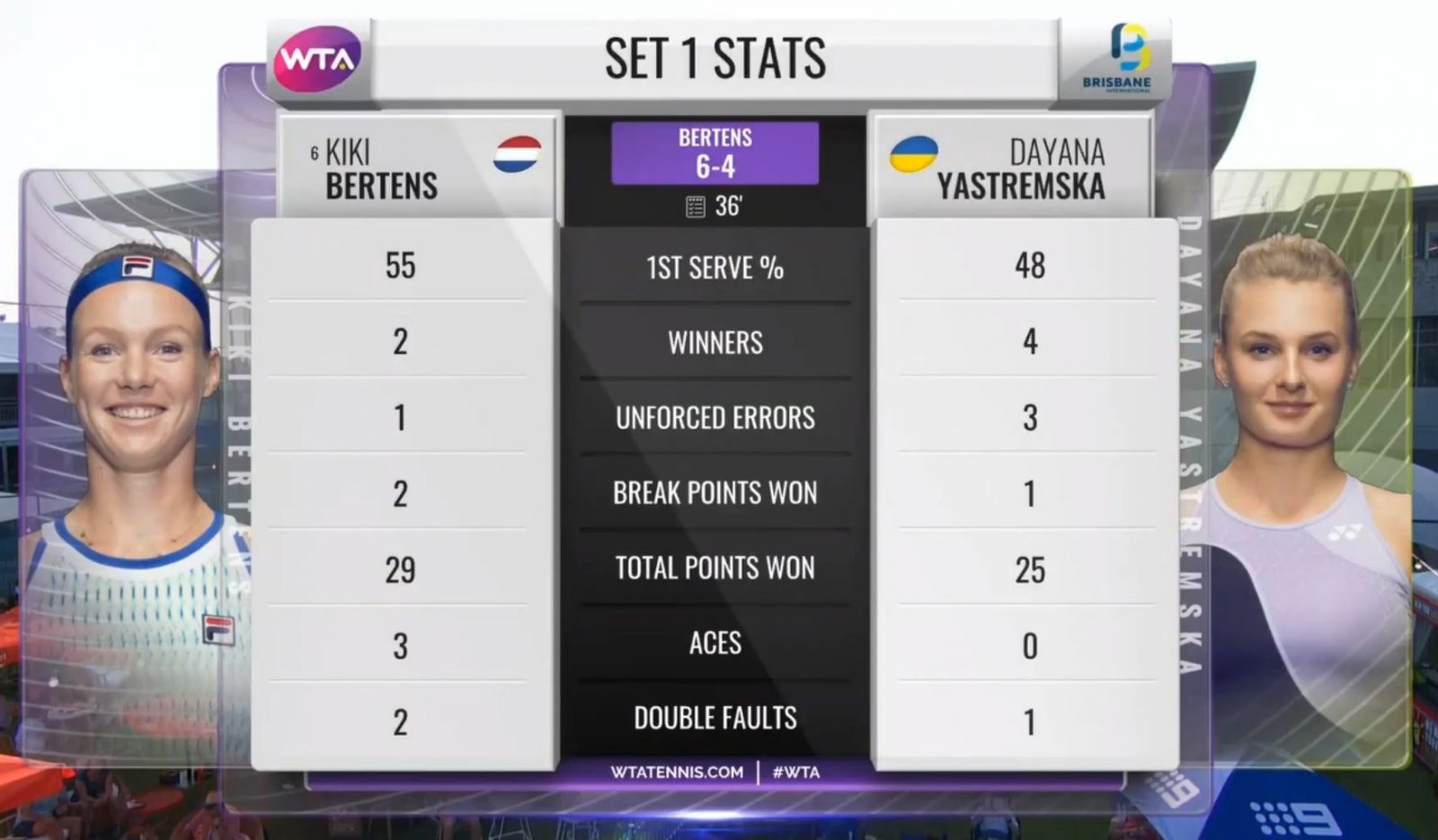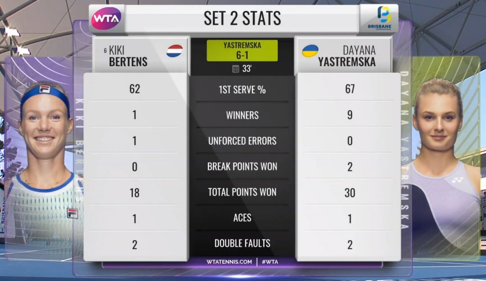 Бертенс після 4:2 особливих шансів на камбек в першій партії не дала, часто її виручала потужна і дуже точна подача. Даяна мала один брейкпойнт в десятому геймі, але шансом не скористалася.