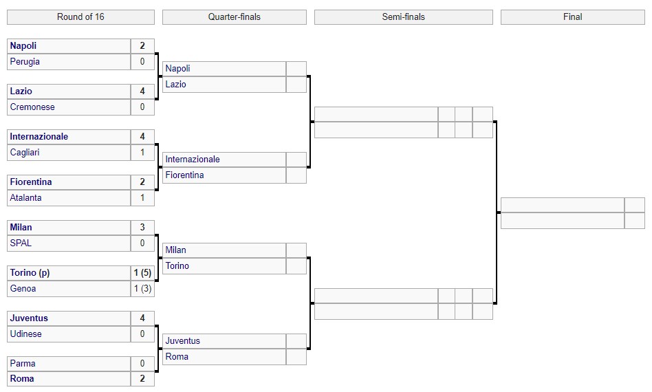 Матчем «Парми» і «Роми» (0:2) завершилася стадія 1/8 фіналу Кубка Італії. Всі результати наведені нижче.