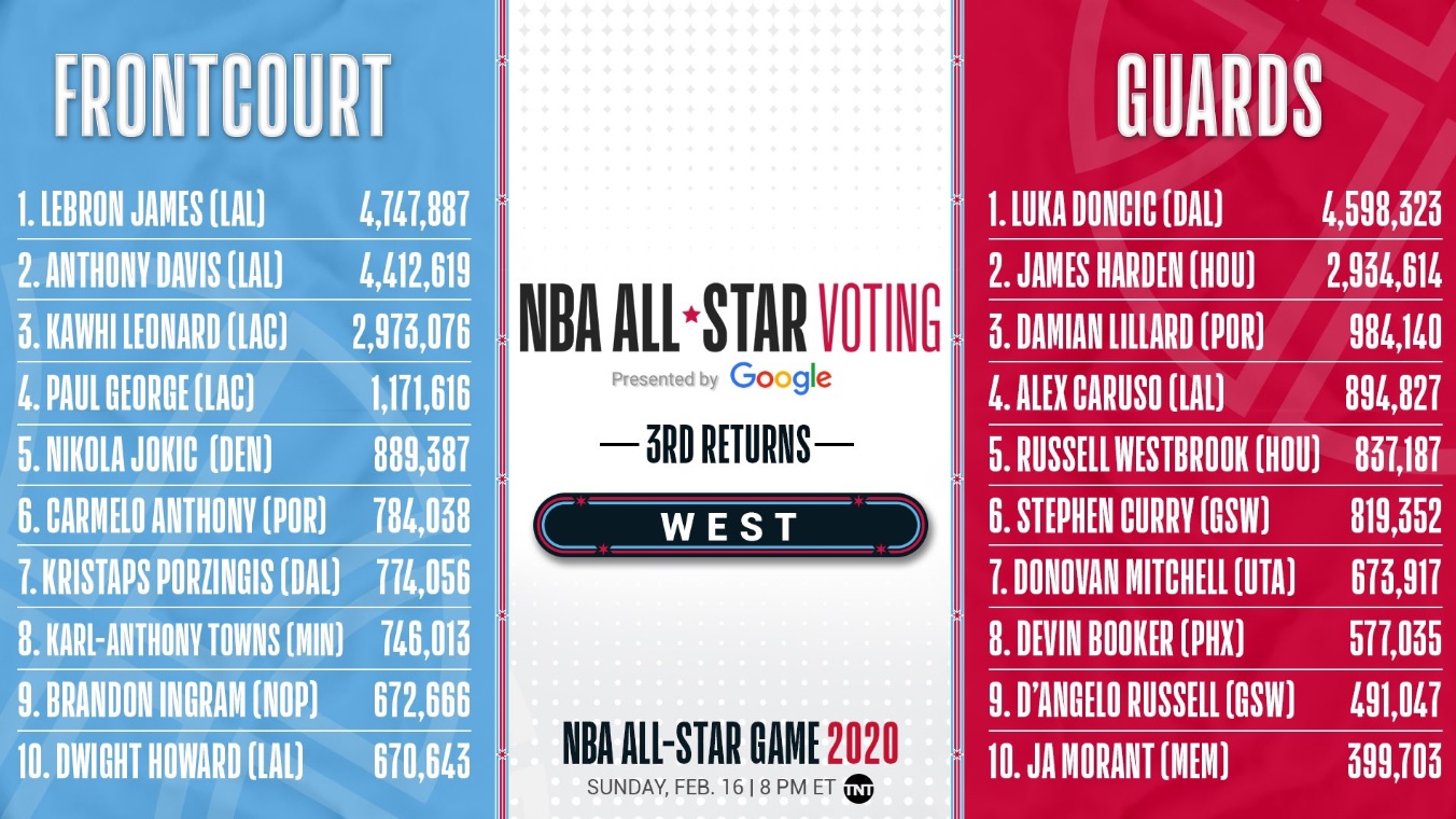 Лідерами є Леброн Джеймс і Лука Дончіч. За форварда «Лейкерс» віддали голос 4,747,887 разів, а за захисника «Далласа» 4,598,393.