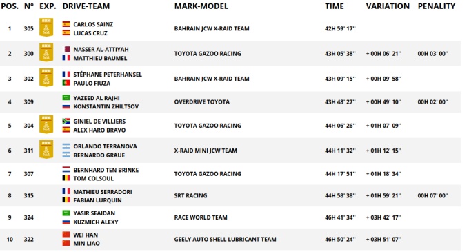 У класі автомобілів за підсумками 12-ти етапів перемогу здобув Карлос Сайнс-старший. Для 57-річного гонщика це третя перемога на ралі-рейді Дакар.