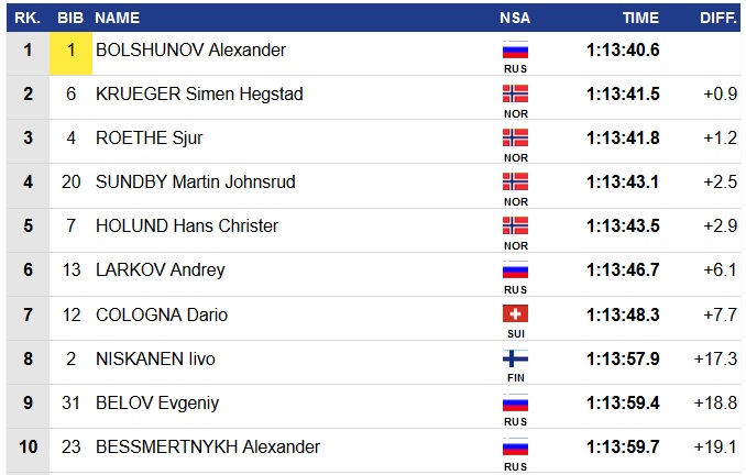 Російський лижник Олександр Большунов виграв скіатлон на етапі Кубка світу в Оберстдорфі і зміцнив лідерство в загальному заліку. Йоханнес Клебо зійшов з дистанції, і тепер програє Большунову в загальному заліку вже 299 очок.