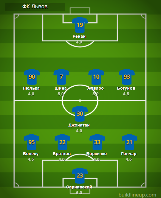 Львів: Сарнавський – Бопесу, Братков, Борзенко, Гончар – Джонатан (Приймак, 82) – Люлька (Велвес, 65), Шина, Алваро, Богунов – Ренан (Яковеллі, 57).