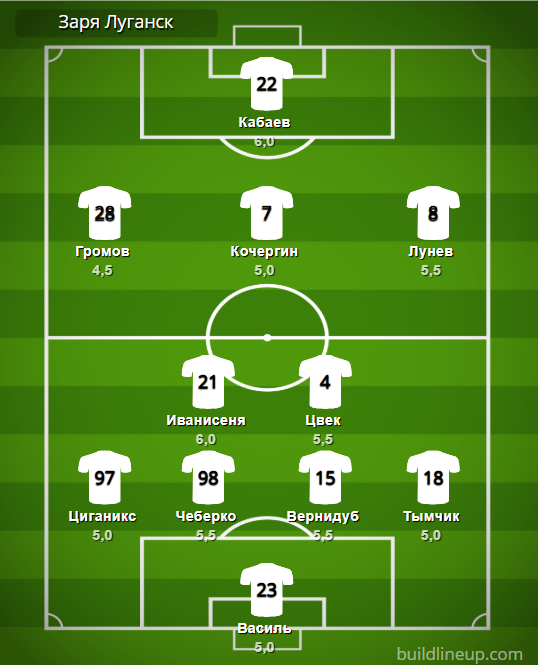 Зоря: Василь – Циганікс, Чеберко, Вернидуб, Тимчик – Іванісеня, Цвек – Громов, Кочергін, Луньов – Кабаєв.