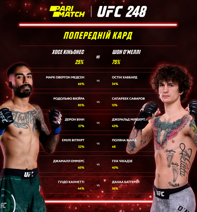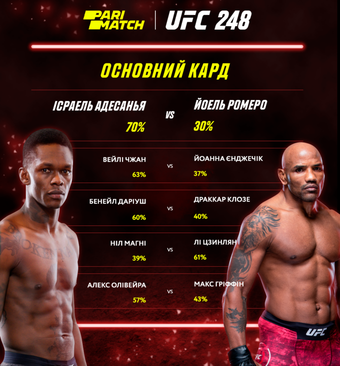 Аналітики Parimatch дають Адесаньї 70% на перемогу. І це не дивно. Ромеро поступився у двох попередніх боях і досить несподівано отримав шанс битися за титул. Тут не обійшлося і без участі самого Ісраеля, який захотів зустрітися з Ромеро.