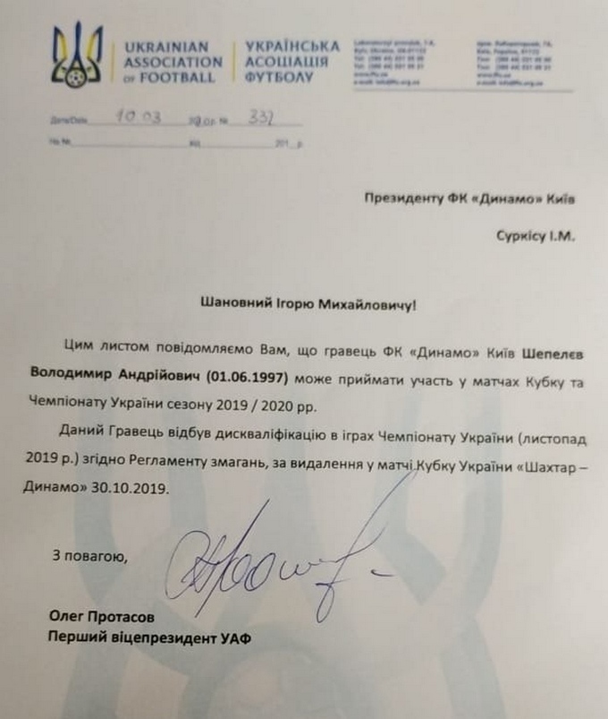 Київське «Динамо» звернулося до Української асоціації футболу за офіційними роз'ясненнями з приводу статусу півзахисника команди Володимира Шепелєва перед матчем 1/4 фіналу Кубка України проти «Олександрії».