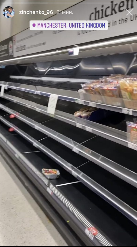 Зінченко на своїй сторінці в Інстаграмі показав, як виглядають полки супермаркету в Манчестері під час пандемії коронавірусу: