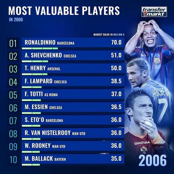 На першому місці опинився півзахисник «Барселони» Роналдіньо (70 млн євро), замкнув трійку форвард «Арсеналу» Тьєррі Анрі (50).