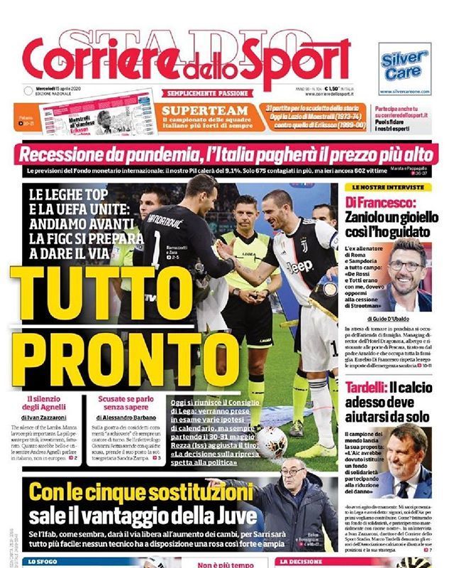 Італійська газета Corriere dello Sport вийшла із заголовком «Tutto pronto», що означає: «все готово». В Італії з нетерпінням чекають відновлення сезону та обговорюють різні варіанти догравання чемпіонату.