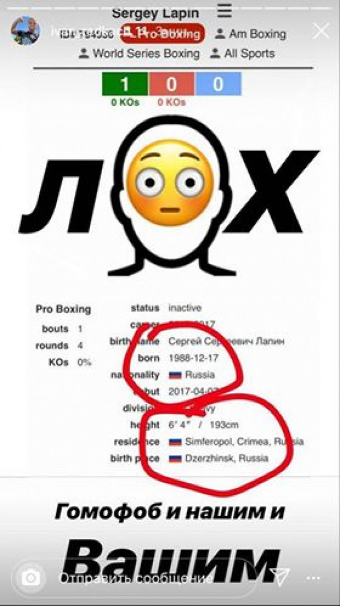 Потім Редкач в своєму Instagram опублікував скріншот сайту боксерської статистики BoxRec, згідно з яким Лапін представляє Росію.