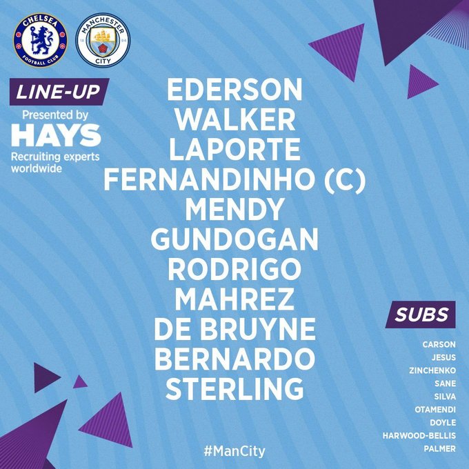 «Манчестер Сіті»: Едерсон, Вокер, Лапорт, Фернандіньо, Менді, Гюндоган, Родріго, Марез, Де Брюйне, Бернардо, Стерлінг.