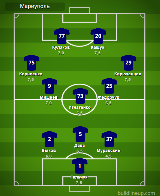 Маріуполь: Гальчук – Биков, Дава, Муравський – Корнієнко (Горбунов, 56), Мишньов (Топалов, 77), Ігнатенко (Чех, 77), Федорчук, Кірюханцев – Кулаков (Чурко, 67), Кащук (Фомін, 55).