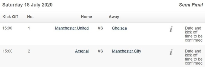 Півфінальні матчі Кубка Англії сезону-2019/2020 відбудуться в суботу, 18 липня. Про це повідомляє офіційний сайт змагань з уточненням, що можливі зміни.