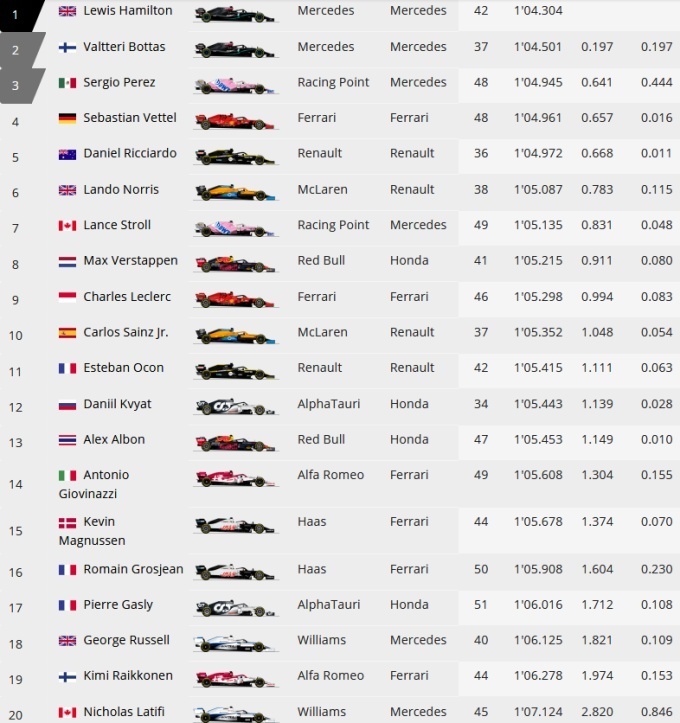 Однак найкращий час все одно залишилося за Мерседесом. Льюїс Хемілтон був найшвидшим і випередив напарника Валттері Боттаса на 0,2 секунди.
