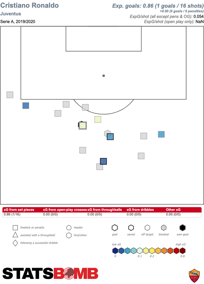 Якщо тоді російський воротар нічого не міг вдіяти, то в інші моменти суперники прямо-таки витворяли дива. Наприклад, Ян Облак з «Атлетіко» якимось дивом відбив чудовий удар у лютому минулого року. Якщо ми подивимося на статистику від StatsBomb, на якій білі квадрати означають штрафні, а сірий колір - блокування, то побачимо, що в цьому сезоні з 14 ударів вісім з них зупиняла стінка. Крім дальньої дистанції, на якій гармата Роналду завжди корисна, логічніше на штрафні ставити Міралема П’янича або Пауло Дібалу.