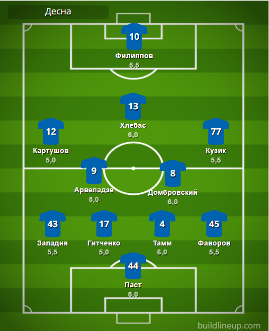Десна: Паст – Западня (Мостовий, 64), Тамм, Гітченко, Фаворов – Арвеладзе (Будківський, 46), Домбровський – Кузик, Хльобас (Огиря, 46), Картушов (Старенький, 71) – Філіппов.