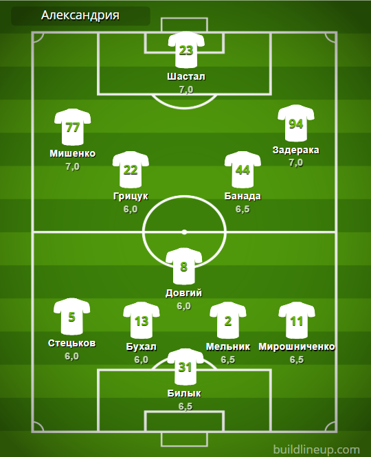 Олександрія: Білик – Стецьков, Бухал, Мельник, Мирошніченко – Грицук (Ковалець, 46), Довгий, Банада – Мишенко (Гречишкін, 60), Шастал (Безбородько, 60, Шендрик, 90), Задерака (Гордієнко, 74).