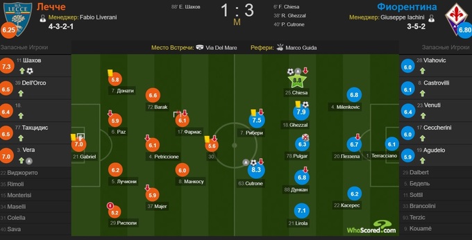 Український півзахисник Євген Шахов став найкращим гравцем «Лечче» в матчі 33-го туру Серії А проти «Фіорентини» (1:3), хоча і вийшов на заміну лише на 72-й хвилині.