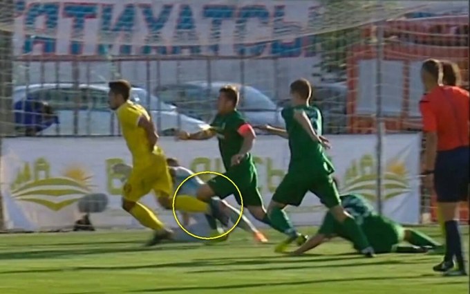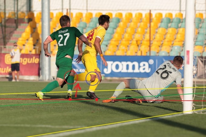 Червона лінія показує, що ліва нога Бочкура в червоній точці ближче до жовтої воротарской лінії ніж Ніки (зрозуміти це допомагає зелена лінія, яка паралельна жовтим), а якщо врахувати, що ліва нога Бочкура має напрямок до воротарской лінії і зігнута в коліні, то коліно ще значно ближче до воротарской лінії.