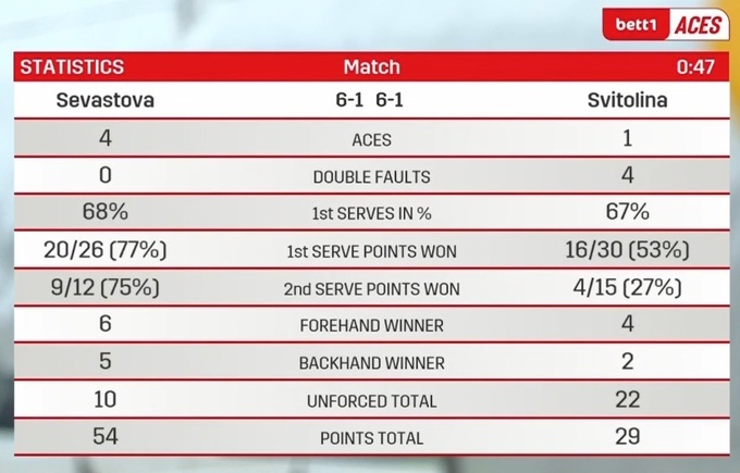 А ось Севастова, як і обіцяла, на харді показала себе краще, ніж на траві. Було помітно, що вона робила на корті все, що хотіла: краще рухалася сама, краще контролювала хід розіграшів. Винятком стали лише сетболи першого сету, на яких вона трохи занервувала, коли не дістала вкорочений від Еліни.