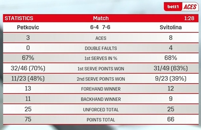 Проти Петкович Світоліна виглядала краще, ніж у вчорашньому матчі, але й суперниця не могла продемонструвати тієї варіативності гри, яку вчора показала Севастова. Еліна могла сьогодні і перемогти в боротьбі, але особливого сенсу в цьому не було. Господарці кортів виграш саме цього матчу точно був важливіший.