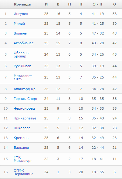 Верхівка Першої ліги: «Інгулець» (53 очки), «Минай» (50), «Волинь» (48), «Агробізнес» (47), «Оболонь-Бровар» (45), «Рух» і «Металіст 1925» (по 44), «Авангард» (42). Йде напружена боротьба за три путівки в Прем'єр-лігу.