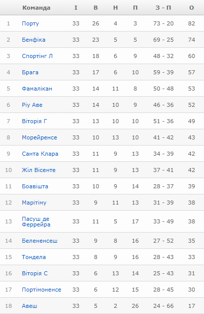 Турнірна таблиця чемпіоната Португалії