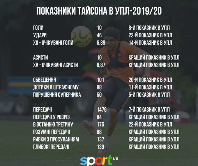 Наприклад, в топ-10 УПЛ за кількістю виконаних передач немає жодного гравця гостроатакуючої спрямованості, крім Тайсона, який займає високу 7-му позицію. Щоб розуміти стиль гри 32-річного бразильця трохи глибше, досить глянути на інші цифри - він кращий в чемпіонаті за передачами в розріз, за розумними передачами, за глибокими передачами і, звичайно ж, за своїми фірмовими ривками з просуванням м'яча.