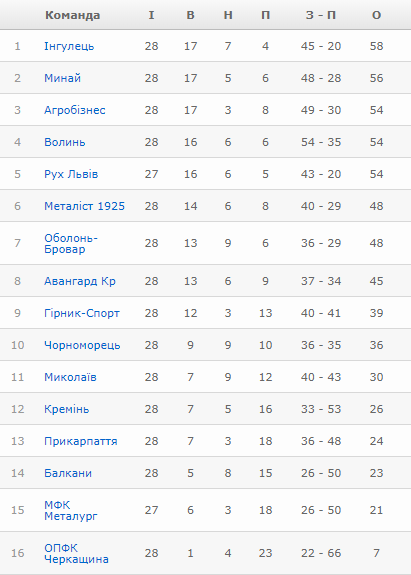 Верхівка Першої ліги: «Інгулець» (58), «Минай» (56), «Агробізнес», «Волинь» і «Рух» (по 54), «Металіст 1925» та «Оболонь-Бровар» (по 48), «Авангард» (45).