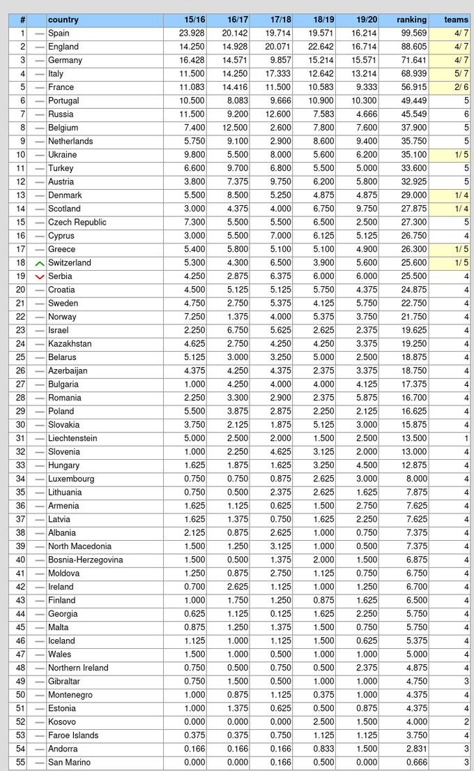 Таблиця коефіцієнтів УЄФА 2020 (впливає на розподіл путівок в сезоні 2021/22)