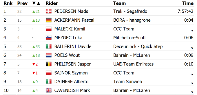 Переможцем другого етапу Туру Польщі став чемпіон світу Мадс Педерсен. У фінішному спринті датський гонщик «Trek Segafredo» випередив Паскаля Аккерманна і Давіде Баллеріні і вийшов в лідери загального заліку.