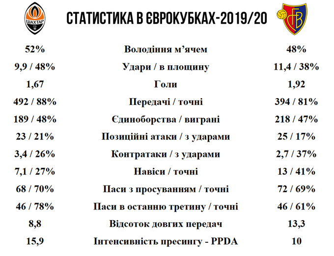 Однак в цілому гра «Базеля» стилістично відрізняється від того, як діє «Шахтар». Щоб краще порівняти між собою ці команди, ми пропонуємо статистику нинішнього єврокубкового сезону, де рівень все-таки більш коректний для порівняння, ніж в матчах чемпіонатів України і Швейцарії.