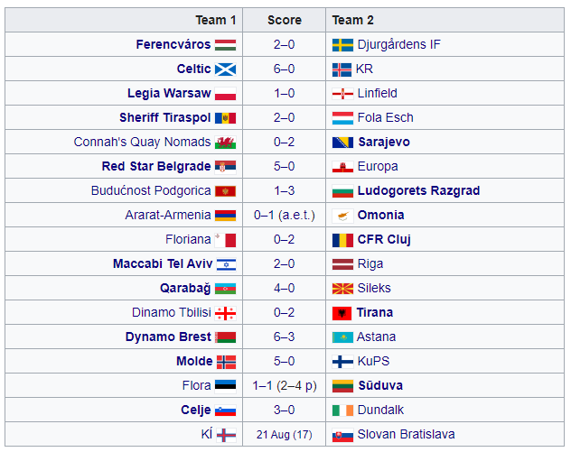- Шериф (Молдова) – Фола (Люксембург) – 2:0