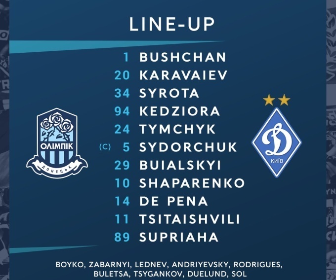 Динамо: Бущан, Кендзьора, Тимчик, Сирота, Караваєв, Сидорчук, Буяльський, Шапаренко, Цітаішвілі, Де Пена, Супряга