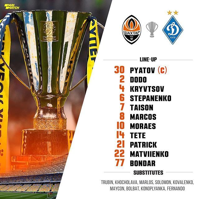 «Шахтар»: Пятов, Додо, Кривцов, Бондар, Матвієнко, Степаненко, Патрік, Маркос, Тете, Тайсон, Мораес.