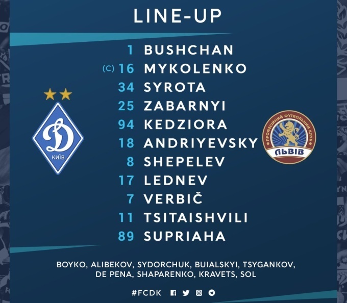 Динамо: Бущан, Кендзьора, Сирота, Забарний, Миколенко, Шепелєв, Андрієвський, Лєднєв, Цітаішвілі, Вербич, Супряга