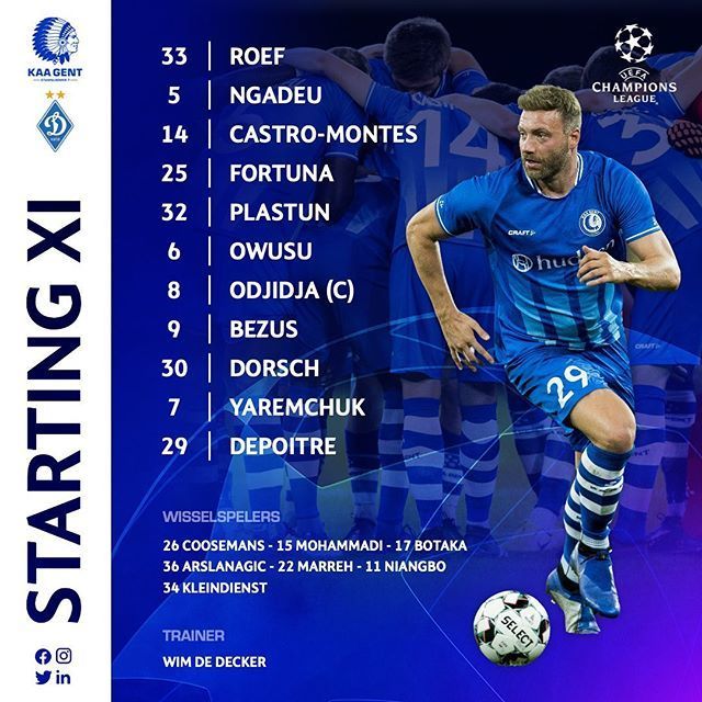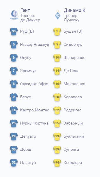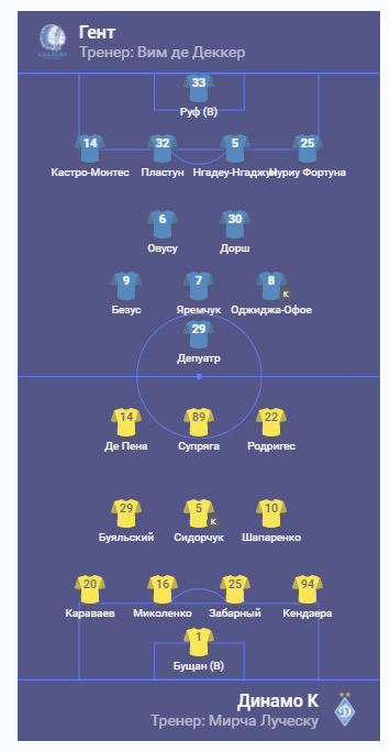 «Гент»: Руф, Фортуна, Нгаде-Нгаджуі, Пластун, Кастро-Монтес, Дорш, Овусу, Оджіджа-Офое, Яремчук, Безус, Депуатр.