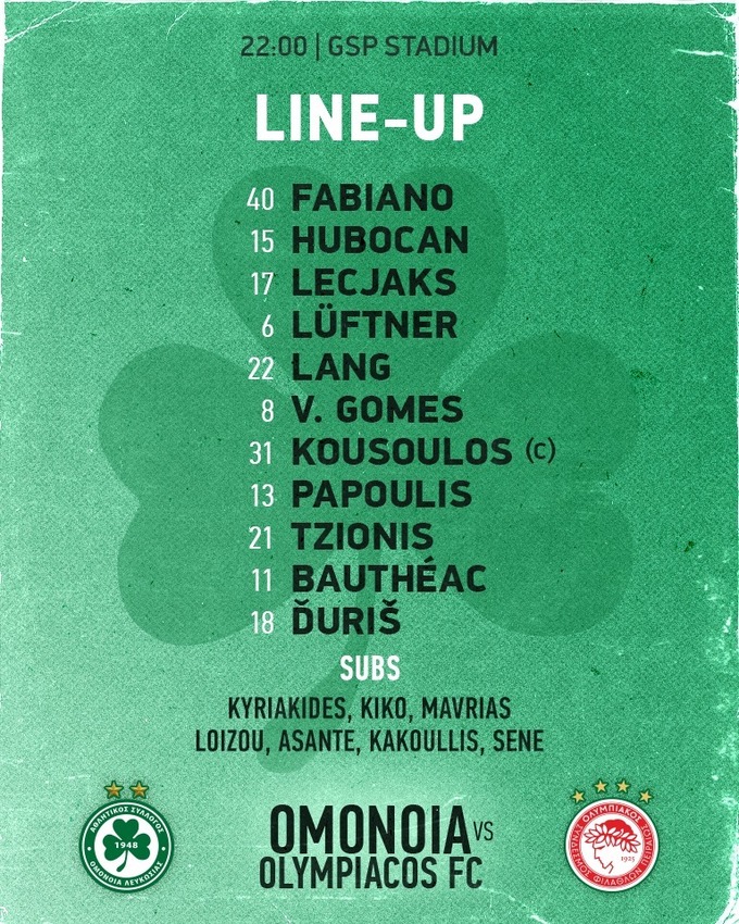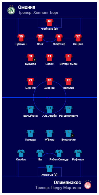 Омонія – Олімпіакос. Греки грають на Кіпрі з форою. Стартові склади